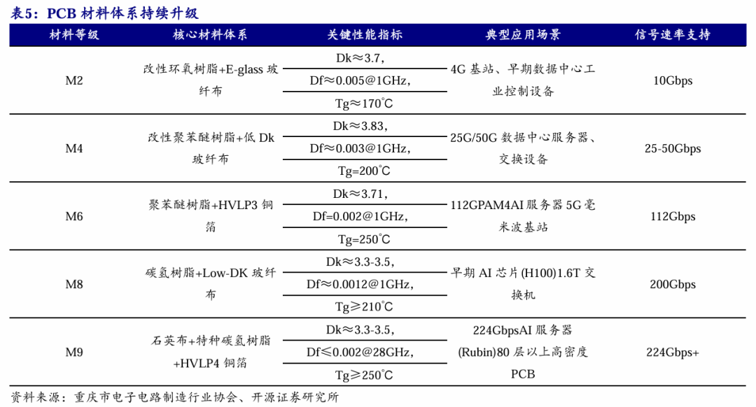 PCB材料体系持续升级,M9级材料将应用于新一代Rubin架构。作为承载AI芯片信号传输与电力分配的核心载体,PCB的性能上限直接决定了AI算力的释放效率,AI算力升级驱动PCB产业从层数升级到材料体系升级。M9级材料兼具低介电损耗、高耐热性,能够解决高速信号传输损耗、高温环境形变、高层数加工精度的核心难点,有望成为高端AI PCB的标配方案。英伟达下一代Rubin架构确定采用M9材料体系,根据研讯社信息,Rubin架构的Midplane和Rubin Ultra架构的正交背板送样验证结果已出,采用M9树脂 HVLP3/4 Q布(石英布)的解决方案。