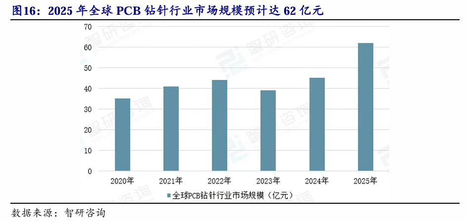 受下游PCB市场景气度提升影响,PCB钻针行业规模重回增长态势。据智研咨询数据,2024年全球PCB钻针行业市场规模为45亿元,同比增长15.4%;2025年市场规模预计将进一步扩大至62亿元,同比增长37.8%。