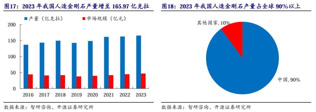 我国是全球最大的人造金刚石生产国,占据重要主导地位。从2000年开始,我国便成为全球最大人造金刚石生产国,2010年产量突破100亿克拉,进一步巩固了我国在全球人造金刚石市场中的领先地位。据智研咨询,2023年我国人造金刚石产量增至165.97亿克拉,占全球总产量的90%以上,行业市场规模约为47.02亿元。