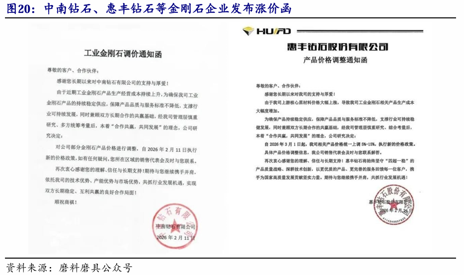 出口管制、上游涨价等因素影响下,近期人造金刚石价格调涨,从“中国成本定价”转向“中国价值定价”。出口管制前,行业长期陷入低端产能扩张与价格战,2025年人造金刚石平均出口单价仅0.25元/克拉,同比下降18%。近期,在出口管制、上游涨价等因素影响下,中南钻石、惠丰钻石、厚德钻石、江西恒钻等多家金刚石企业密集发布价格调整通知,惠丰钻石自2026年3月1日起,对相关产品价格统一上调5%-15%。