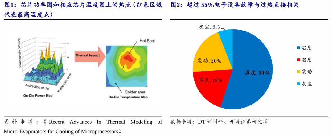 芯片内部热量无法有效散发时,局部区域会形成“热点”,导致性能下降、硬件损坏及成本激增。(1)性能下降:据《Cabontech Magazine》,当电子设备温度过高时,工作性能会大幅度衰减,当芯片表面温度达到70-80℃时,温度每增加1℃,芯片的可靠性就会下降10%。AI硬件的高功率需求下,过热限制了硬件性能的发挥,阻碍了芯片的理论性能实现。(2)设备失效:芯片温度每升高10℃,其运行寿命减半,超过55%的设备故障与过热直接相关。(3)成本激增:企业每年需投入数亿美元在散热系统上,包括大量消耗能源和资源的冷却系统(如液冷、风冷等),不仅增加了运营成本,也加剧了能源消耗;(4)安全隐患:极端情况下,温度过高可能引发火灾等严重事故,给设备和人员安全带来威胁。