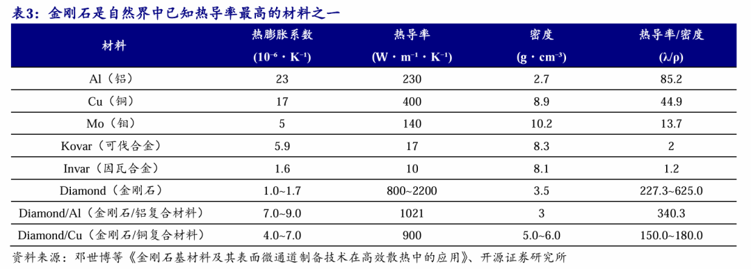(1)热导率:金刚石是自然界已知热导率最高的材料,热导率区间800~2200W/m·K,其上限值是当前主流散热材料纯铜的5.5倍、纯铝的9.6倍。