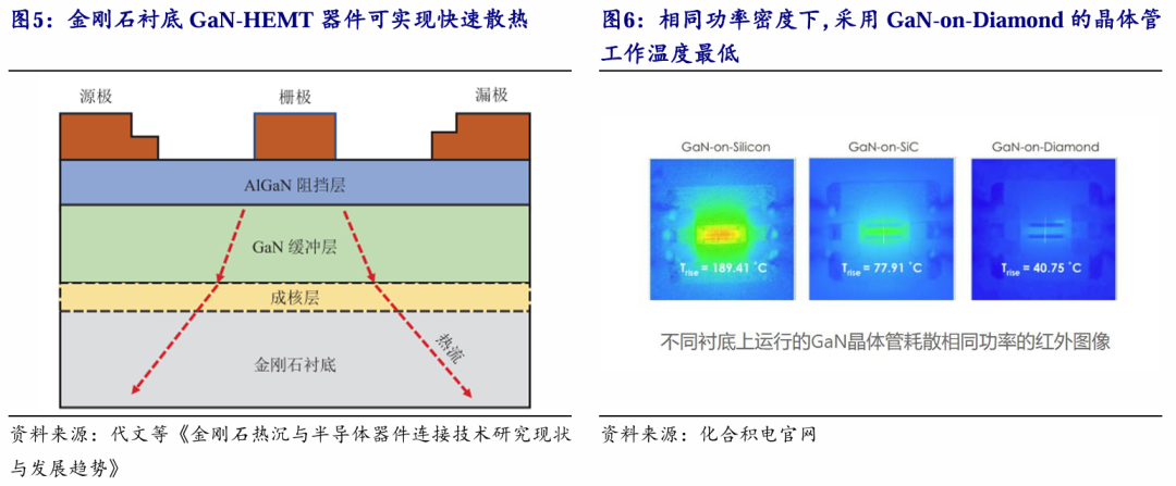 金刚石作为散热材料主要有三种方式:作为金刚石衬底、作为热沉片、以及通过在金刚石结构中引入微通道散热。金刚石衬底方案通过外延工艺将半导体功能层直接生长于金刚石衬底之上,具备热阻小、散热效率优的优势;金刚石热沉片作为封装后道环节的独立散热部件,可适配现有芯片设计与封装产线,具备兼容性强的特点;金刚石微通道散热方案为金刚石散热与液冷技术深度融合的技术路线,通过材料和结构的深度协同,实现对热量的源头拦截和高速疏通,能有效解决AI服务器及芯片散热问题。例如在GaN-on-diamond结构中,金刚石的超高热导率使热量能迅速从器件有源区传导至封装散热片,有效避免局部过热。相同的功率密度下,GaN-on-Diamond可以使晶体管工作温度较GaN-on-SiC至少降低40%,使器件寿命增加约10倍。