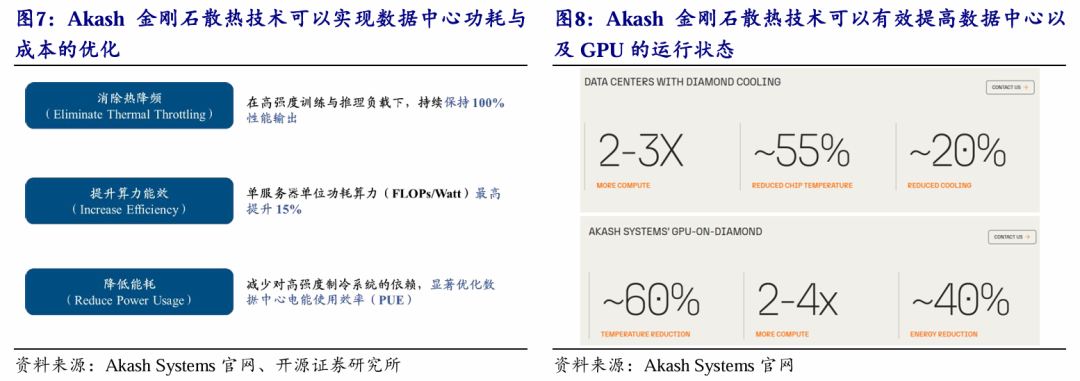 据Akash Systems官网数据,搭载Diamond Cooling散热技术的数据中心能在高达50°C(122°F)的环境温度下,实现约15%的每瓦算力性能提升,并维持GPU满负载无降频运行。若以部署了1万张H200 GPU的数据中心测算,相当于等效增加了1500张GPU的有效算力输出,直接提升数据中心资本开支的使用效率,优化总拥有成本(TCO)。此外,搭载该方案的服务器可在50℃的高温环境下保持稳定运行,弱化了数据中心对选址地理环境、配套温控基础设施的约束,进一步拓宽了算力基础设施的可部署范围。
