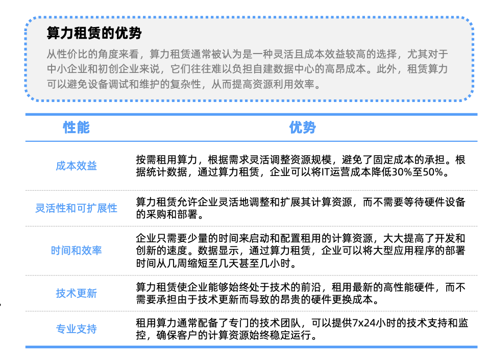 由于自建高端算力设施的成本高昂,往往难以满足自身的算力需求而遭遇算力瓶颈,算力租赁成为解决短期内算力缺口的优选方案。