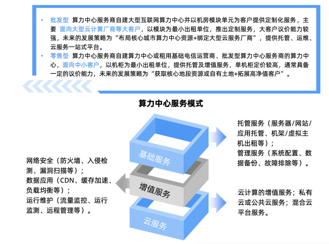 万国数据覆盖全国逾70座城市,机柜超19万;世纪互联覆盖30 城市,运营50 数据中心;光环新网新建的数据中心单机柜可支持10千瓦到20千瓦功率,可支持大模型训练服务,客户可以根据实际需求,选择适合的算力资源进行租赁,并按实际使用量付费;润泽科技的业务模式定位于批发型业务,主要服务于头部互联网公司、云厂商等核心客户;字节除自建AIDC智算中心以满足自身对算力的巨大需求,同时也与润泽科技等IDC算力合作伙伴开展合作。