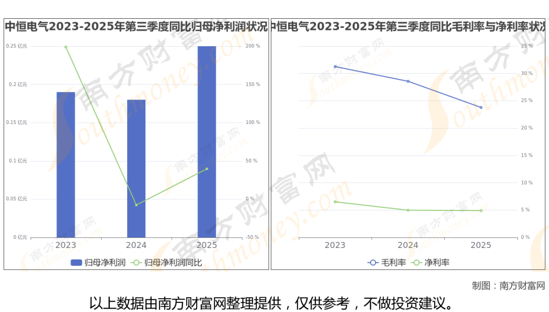 2025年第三季度季报显示,中恒电气公司实现净利润2509.05万,同比增长39.66%;毛利润为1.25亿,毛利率23.79%。