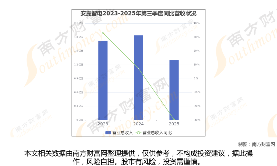 于2025年第三季度,安靠智电披露了其业绩表现(如上图),其中主营业务收入1.3亿元,相较于去年同期-29.64%。