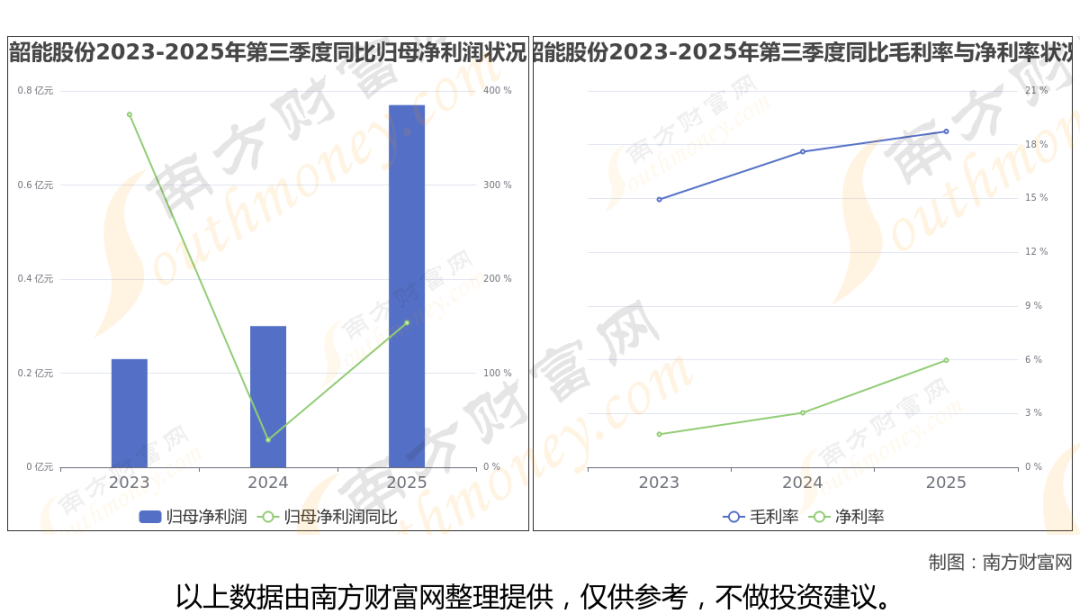 2025年第三季度季报显示,韶能股份公司实现净利润7663.86万,同比增长153.51%;毛利润为2.45亿,毛利率18.74%。