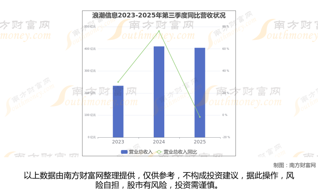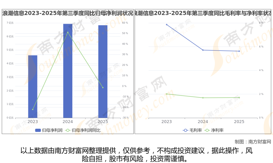 2025年第三季度季报显示,浪潮信息公司实现净利润6.83亿,同比上年增长率为-1.34%,毛利率5.62%,归属净利润6.83亿,同比增长-1.34%。