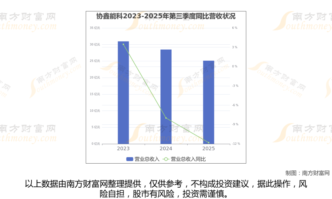 在2025年第三季度,协鑫能科的业绩表现(如上图),主营业务收入达到25.13亿元,实现了-11.81%的同比增长率。