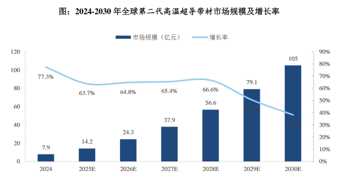 根据赛迪数据,2024年全球第二代高温超导带材市场规模为7.9亿元,同比增长77.3%,预计2030年市场将超百亿规模,达到105.0亿元,2024至2030年间的复合增长率为53.9%。