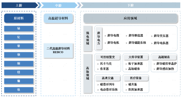 高温超导磁体较之低温超导磁体,能实现更高的磁场强度、更宽的工作温区、更低的失超风险,因而有其独特而广泛的应用场景,如非磁金属热处理、磁控硅单晶生长、可控核聚变、超导磁储能、超导磁悬浮列车、电磁弹射、超导磁选矿、超导污水处理等需要强磁场的领域。