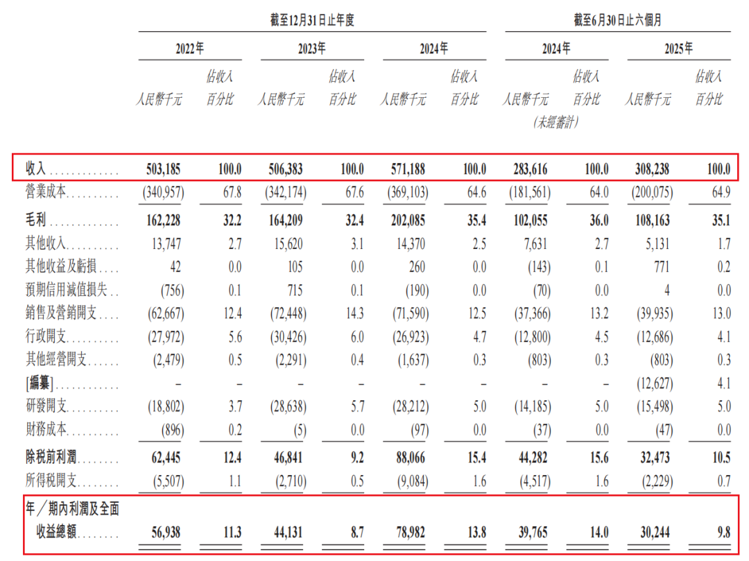 《招股说明书》显示,2022年至2025年6月底(以下简称:报告期),铜师傅的营收分别为5.03亿元、5.06亿元、5.71亿元和3.08亿元,同期净利润分别为0.57亿元、0.44亿元、0.79亿元和0.30亿元。