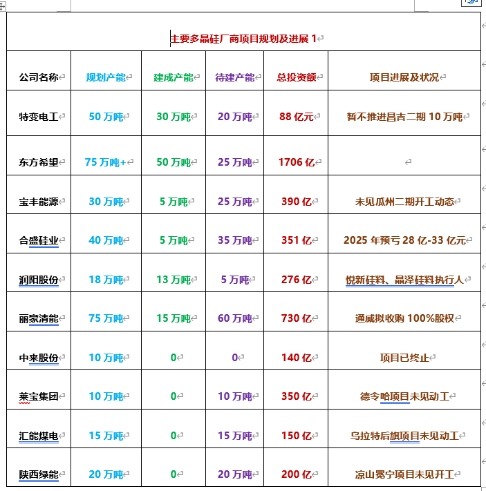 新特能源的多晶硅建成产能30万吨,规划产能50万吨。其中包头20万吨一期10万吨,昌吉准东20万吨一期10万吨已建成投产,暂不推进的为昌吉二期10万吨。