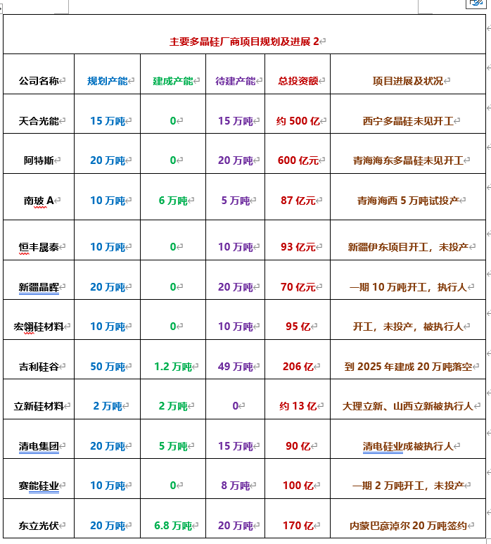 总投资70亿元新疆晶晖新材料有限公司(简称“新疆晶晖”)20万吨多晶硅一期10万吨于2024年2月26日开工,原计划在2025年初建成投产,也未见其披露投产动态。新疆晶晖已5次列入“被执行人”,公司法定代表人还5次上了限制高消费名单。