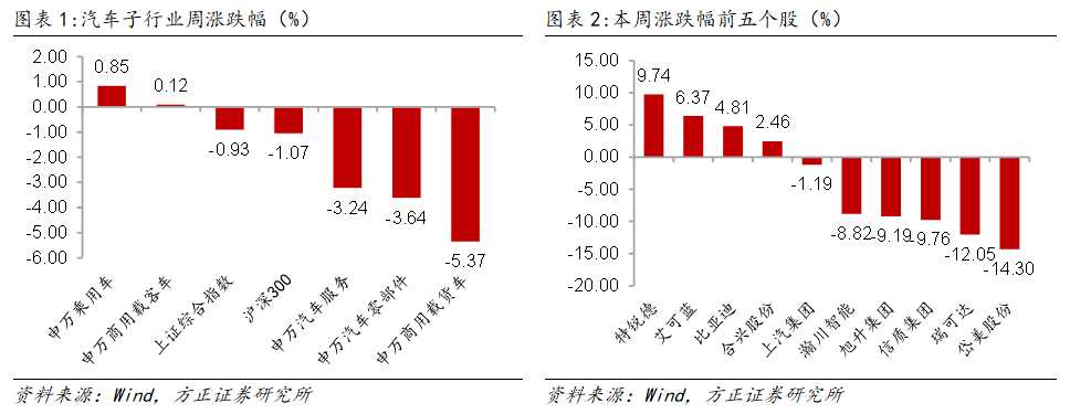 本周A股汽车行业涨幅靠前的公司为特锐德、艾可蓝、比亚迪、合兴股份,涨幅分别为9.74%、6.37%、4.81%、2.46%;跌幅靠前的重点公司为岱美股份、瑞可达、信质集团、旭升集团、瀚川智能,跌幅分为-14.30%、-12.05%、-9.76%、-9.19%、-8.82%。