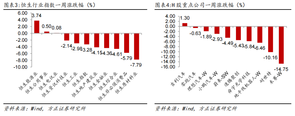 本周恒生指数下跌3.28%,重点个股吉利汽车上涨1.30%,零跑汽车下跌0.63%,理想汽车-W下跌1.89%,小鹏汽车下跌2.93%,蔚来-SW下跌4.49%,速腾聚创下跌5.43%,舜宇光学科技5.84%,地平线机器人-W下跌6.46%,耐世特下跌10.16%,禾赛-W下跌14.75%。