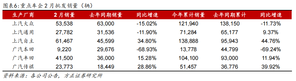 2月自主品牌同比表现强于合资趋势延续。2026年2月车市分化加剧,自主强势合资承压态势延续。上汽自主、广汽传祺延续高增,2月分别同比增长34.80%、28.86%,1-2月累计增幅达44.76%、39.93%。反观合资阵营,除广汽丰田逆势增长15.28%外,广汽本田、上汽大众、上汽通用分别深跌68.93%、15.02%、11.90%,市场格局重塑趋势愈发明晰。