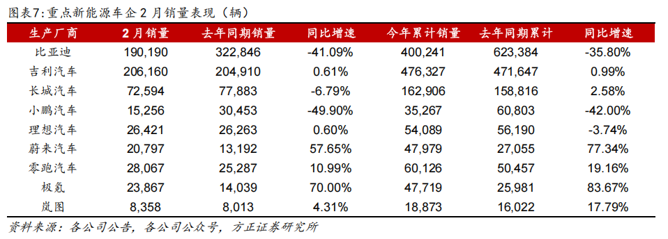 2月多数新能源车企销量表现平稳。2026年2月,国内重点新能源车企整体表现稳健,多数实现销量同比增长。分车企来看,极氪汽车表现突出,2月销量达23,867辆,同比增长70.00%,增速位居首位;蔚来汽车紧随其后,销量达20,797辆,同比增长57.65%,增速位列第二。此外,零跑汽车、岚图汽车、吉利汽车与理想汽车亦均录得同比正增长。