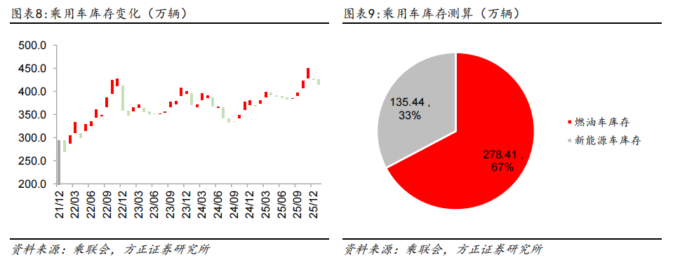 2026年1月乘用车库存环比下降。2026年1月乘用车库存下降11.7万辆,当前库存为413.9万辆。2026年1月乘用车库存中燃油车占比67.3%,为278.4万辆,新能源汽车占比32.7%,为135.4万辆。