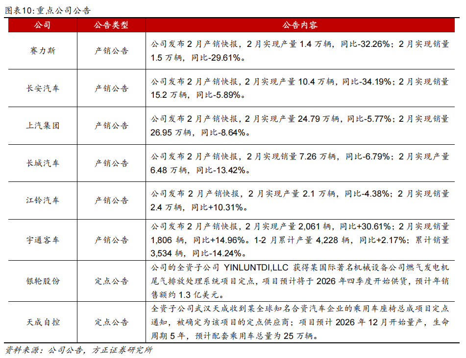 公司层面:1)赛力斯:2月实现产量1.4万辆,同比下降32.26%;2月实现销量1.5万辆,同比下降29.61%。2)宇通客车:2月实现产量2,061辆,同比 30.61%;2月实现销量1,806辆,同比 14.96%。3)长安汽车:2月实现产量10.4万辆,同比-34.19%;2月实现销量15.2万辆,同比-5.89%。4)银轮股份:全资子公司YINLUNTDI,LLC获得国际著名机械设备公司燃气发电机尾气排放处理系统项目定点,项目预计将于2026Q4开始供货,预计年销售额1.3亿美元。