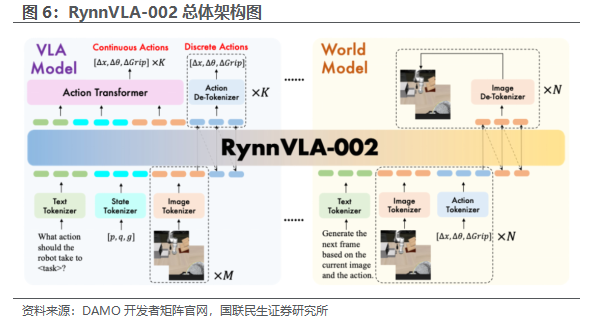 产业:具身智能大脑、世界模型成为机器人领域发展的重点。1)具身智能的“大脑”是实现智能泛化的关键,在“大脑”即AI模型层面,视觉-语言-动作模型(VLA)与世界模型(WorldMode)的融合或将成为主流趋势。阿里达摩院12月发布的RynnVLA-002,将VLA模型与世界模型统一在单一框架中,形成了“动作世界模型”。这种架构实现了双向增强:世界模型利用物理规律优化动作生成,而VLA则增强了视觉理解以支持更精准的图像预测。在LIBERO仿真基准测试中,RynnVLA-002无预训练的情况下达到了97.4%的成功率。2)国产世界模型公司极佳视界发布并开源具身世界模型GigaWorld-0,成功将世界模型生成数据在VLA训练中的占比提升至90%。所训练的VLA模型在新纹理、新视角、新物体位置三大泛化维度上均实现近300%的性能提升,标志着具身智能正式迈入“数据高效、高泛化、低成本”的新阶段。