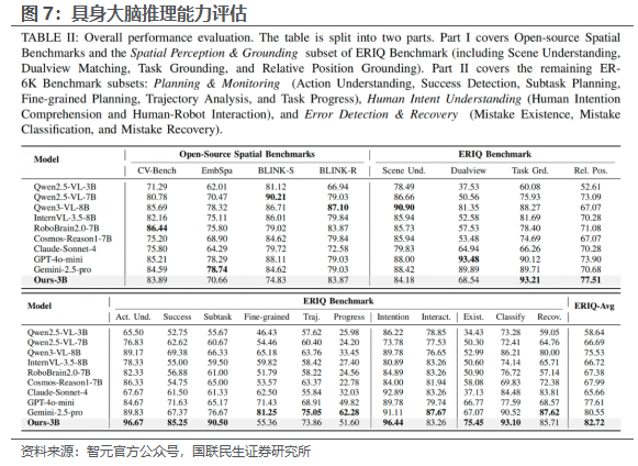 头部企业技术持续创新,引领行业发展。智元具身研究中心推出第二代一体化具身大小脑系统GenieReasoner。针对VLA模型中语义推理与动作控制的模态对齐难题,智元具身研究中心提出了一种支持统一离散化预训练的模型架构,并通过流匹配缓解了传统离散Tokenizer的动作精度瓶颈。同时具身研究中心开源了ERIQ-聚焦于真机操控全流程的具身推理评测基准,用以解耦量化评估VLA中具身大脑不同维度的推理能力。智元具身研究中心团队在ERIQ benchmark、仿真环境GenieSim以及多种真机本体上进行了全面的测试。在ERIQ Benchmark对模型大脑推理能力的解耦评测中显示,GenieReasoner在具备优秀的通识能力的同时,在具身榜单ERIQ 的15个子任务(包括空间感知、任务规划、纠错等)中刷新了性能SOTA纪录,平均推理准确率相比base模型大幅提升,并超过了顶级闭源模型。