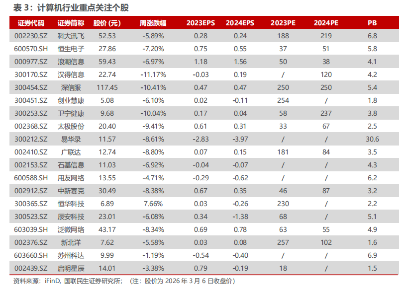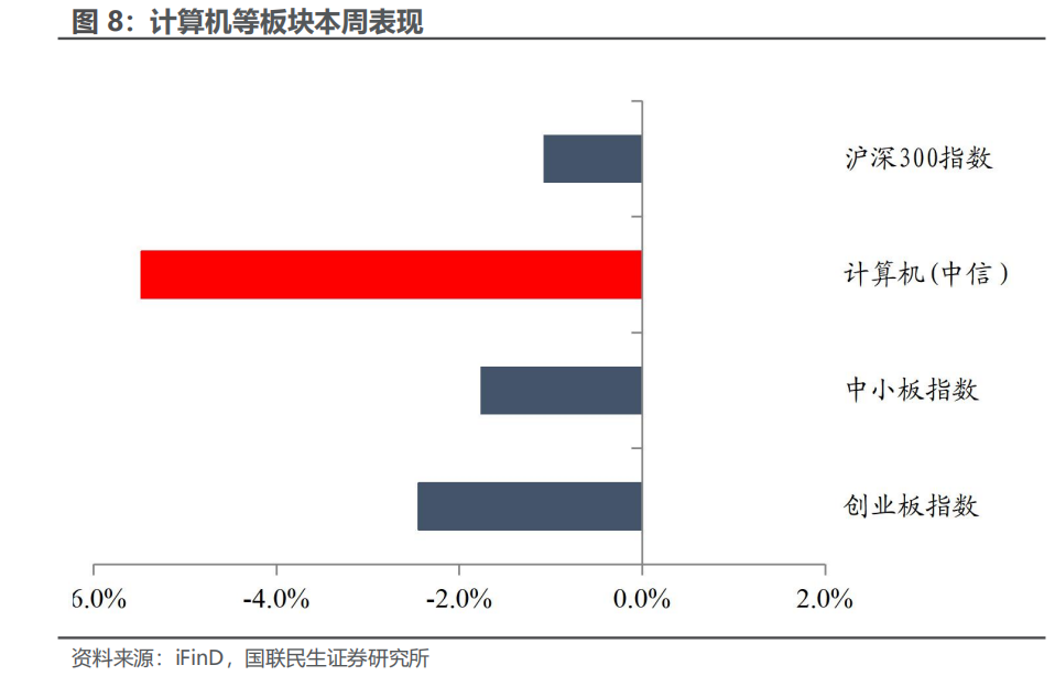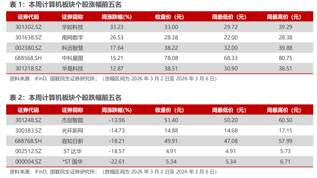 本周(03.02-03.06)沪深300指数下跌1.07%,中小板指数下跌1.76%,创业板指数下跌2.45%,计算机(中信)板块下跌5.48%。板块个股涨幅前五名分别为:华如科技、南网数字、科远智慧、中科星图、华是科技;跌幅前五名分别为:ST国华、ST达华、容知日新、光环新网、杰创智能。