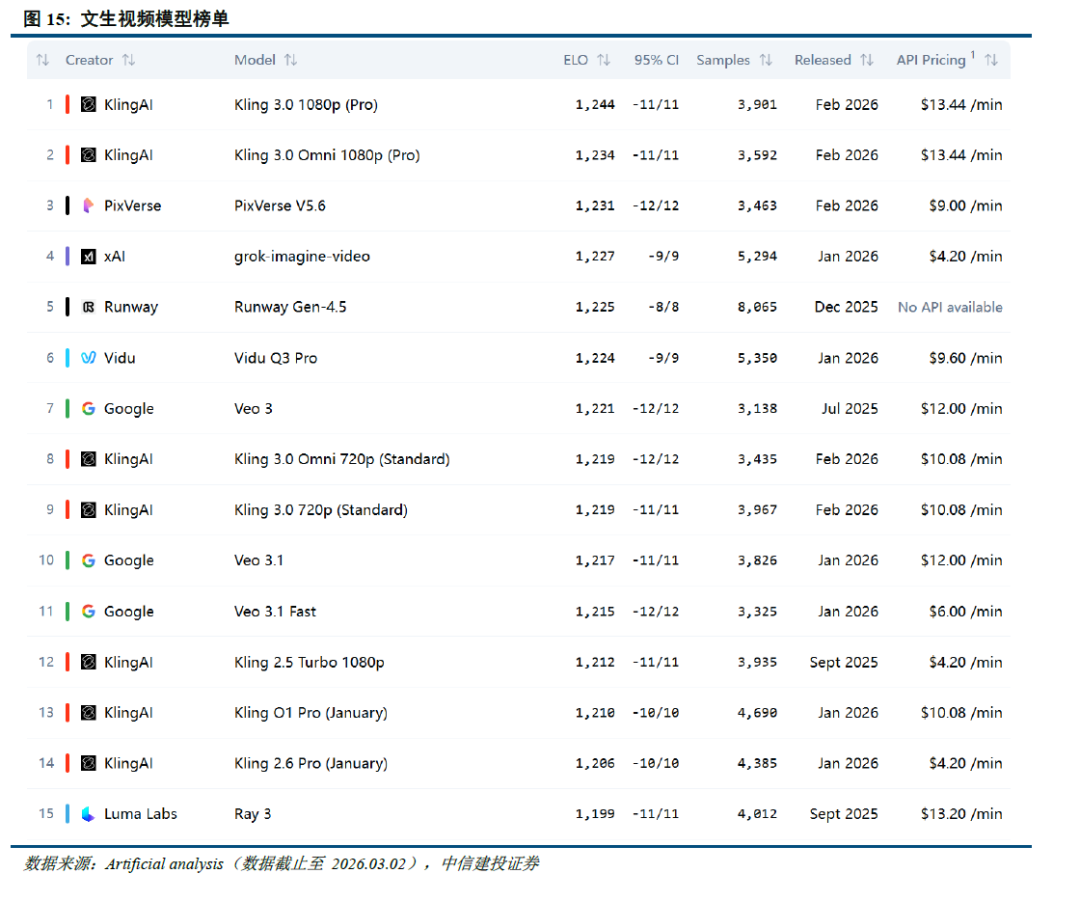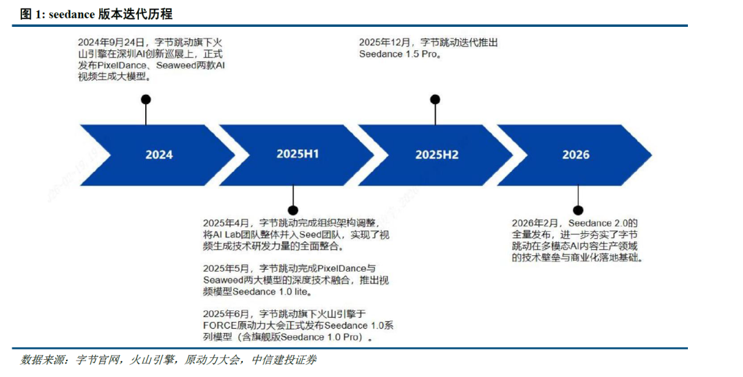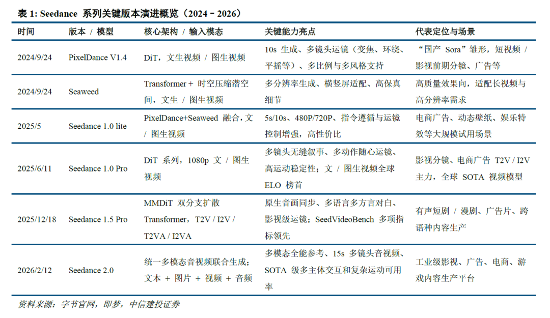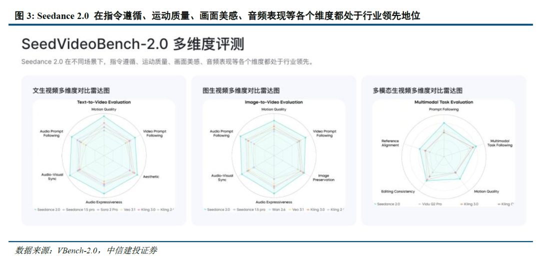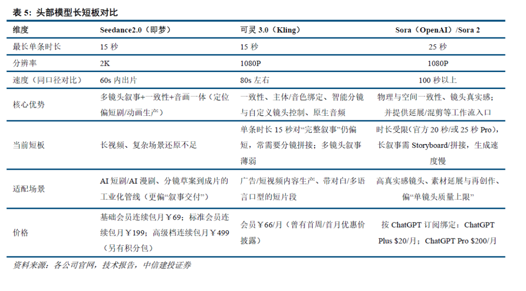 Seedance入局带来AI视频赛道怎样的格局变化:首先我们认为AI视频产品快速迭代,同梯队内产品技术能力和产品工程化能力基本同步,一般来讲谁最新发布表现最优,第一梯队内产品不存在代际差异;其次尽管Seedance 2.0在可控性上迈出了一大步,与Google Veo 3.1、可灵3.0等竞品相比,Seedance 2.0也并非在所有方面都遥遥领先。总结来看,Seedance 2.0对标的是Sora 2当初问世时对于视频复杂度的支持能力,不再是画面与画面的拼接,开始有了镜头语言的雏形,懂分镜、懂节奏,带有短视频/广告片的网感,更适配普通用户及一般创作者;可灵3.0侧重多镜头输入,面向专业影视创作者。
