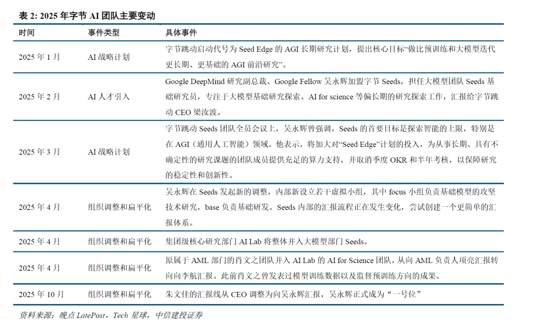 从团队看,字节AI Seed团队在大模型和视频生成领域属于“起步偏晚但加码最猛”的典型路径:自2023年正式组建以来,依托Flow–Seed–Stone三层AI架构、AI Lab整并、Seed Edge长期AGI研究计划,叠加大规模资本开支与高强度股权激励,短短三年完成了从内部补课团队到集团级“技术底座”的跃迁。2024-2025年字节围绕AI团队进行了一系列组织架构的调整,这一轮重构的内核是:在组织上将所有大模型与多模态研发统一收拢于 Seed,从双负责人到由吴永辉主导,标志着Seed在组织架构上形成“基础研究一号位”格局,业务方向进一步向底层模型能力集中。