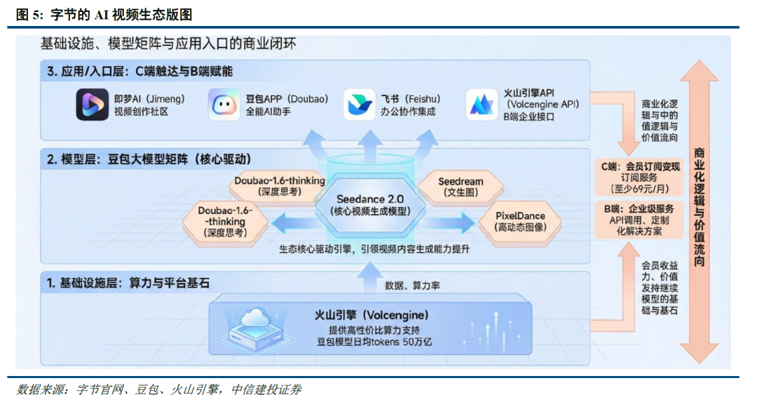产品及商业化:Seedance的商业化,本质上不是“卖一个视频模型”,而是嵌入字节的 C 端应用矩阵与火山引擎 MaaS 体系,形成“流量—算力—应用”三位一体的闭环。当前阶段,C 端以即梦订阅和豆包导流为主,更多在做用户规模与内容生态的占位;B 端则依托火山引擎极低的 Token 单价和完备的多模态能力,已经进入以规模效应和 Agent 解决方案驱动收入的阶段。