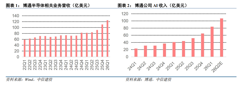 博通发布2026财年Q1财报,公司实现营收193.11亿美元,同比增长29%,归母净利润73.49亿美元,同比增长34%,均超市场预期。AI相关业务营收达84亿美元,同比增长106%,AI业务高增主要受定制AI加速器和AI网络设备需求推动。公司的AI加速器业务一季度同比增长140%,这一势头预计延续至二季度:谷歌TPU的需求强劲,并将在2027年进一步加速。博通计划向Anthropic供货,目标是2026年实现1吉瓦产能,2027年达到3吉瓦以上。第三大客户Meta的定制加速芯片MTIA路线图进展顺利,已开始出货。第四、第五大客户今年出货量表现强劲,预计2027年将实现翻倍以上增长。公司新增OpenAI为第六大客户,预计其第一代XPU将在2027年实现大规模部署,算力容量超过1吉瓦。公司预计2027年的总交付量将接近10吉瓦。