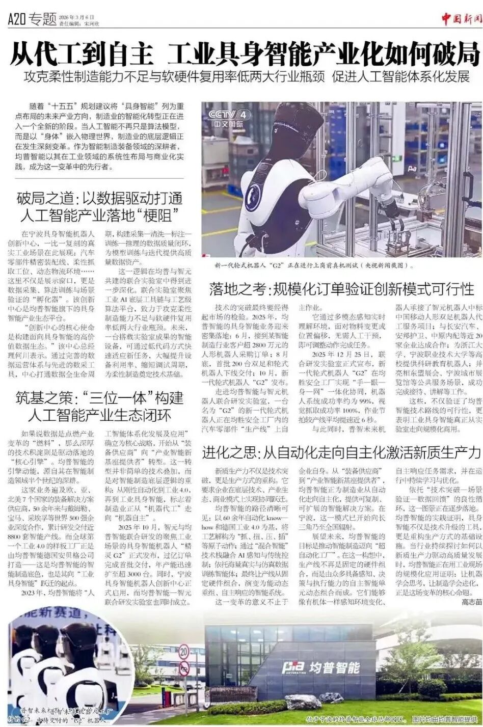 聚焦全国两会热点,均普智能(股票代码:SH688306)重磅登上《中国新闻》报两会专题,以题为《从代工到自主,工业具甚至能产业化如何破局》的深度报道,展现企业在具身智能领域从代工制造迈向自主研发、规模化量产的转型成果,为中国智能制造产业发展提供实践样本。