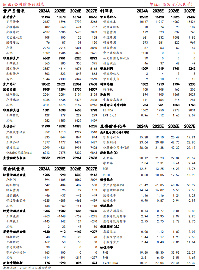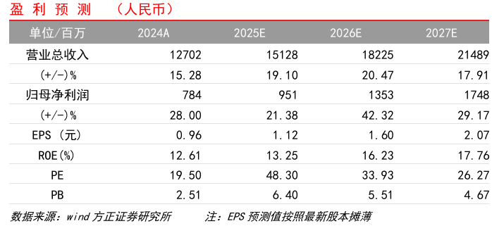 盈利预测:我们预测公司2025-2027年实现营收151/182/215亿元,同比 分别 19%/ 20%/ 18%,归母净利润实现9.5/13.5/17.5亿元,同比分别 21%/ 42%/ 29%,对应PE分别为48/34/26,维持“推荐”评级。