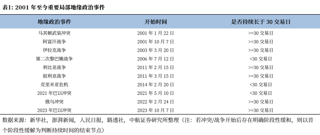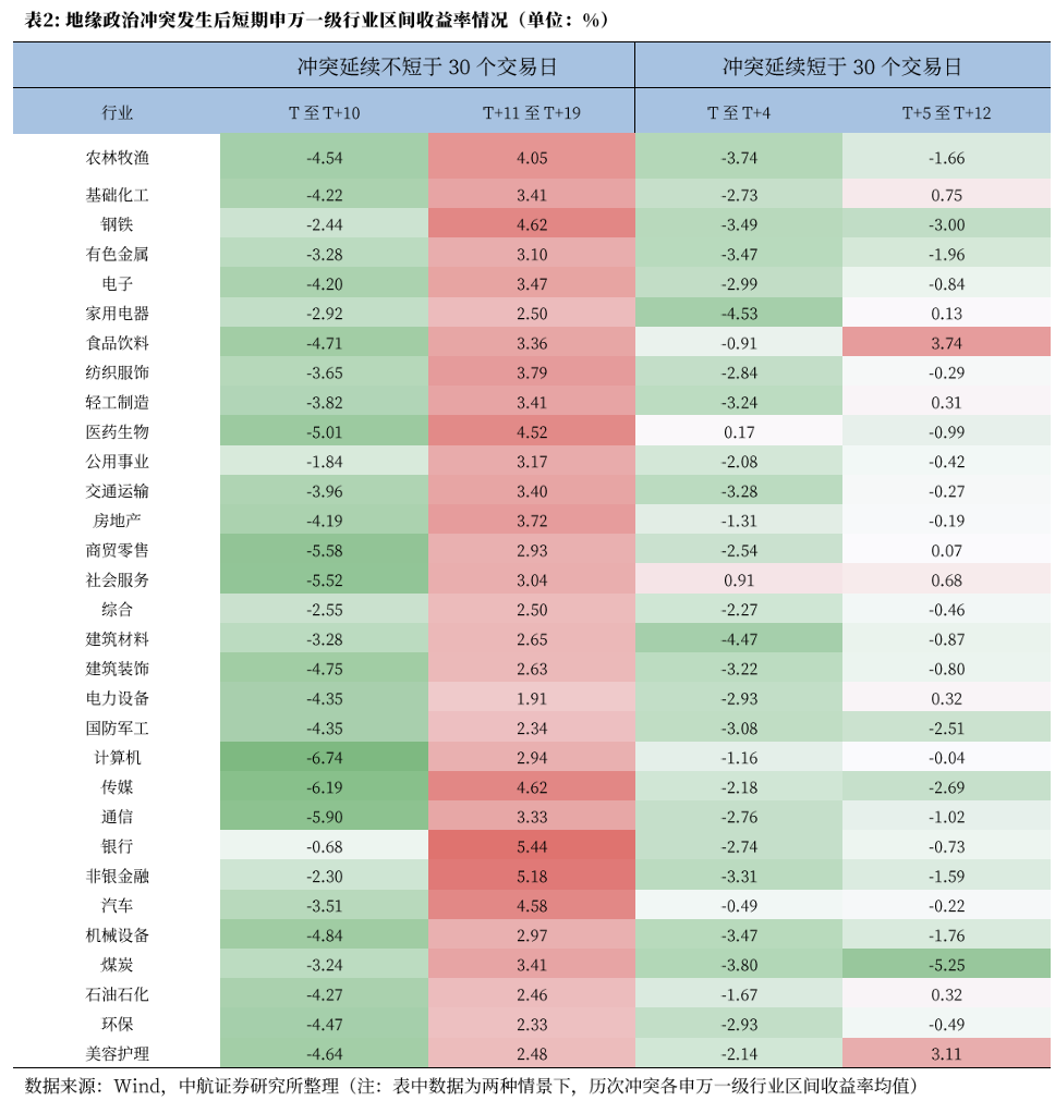 当前市场焦点在于冲突的持续时间,目前市场普遍认为特朗普此前提出的四到五周是一个重要的观测点。但我们复盘发现,局部地缘冲突无论冲突持续时间长短,若仅情绪冲击,则冲突开始后对于A股的影响时间大致为一至两周,万得全A平均下跌约3%,情绪影响结束后A股将迎来一波约两周的修复,然后回归原本走势。