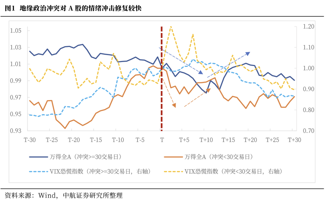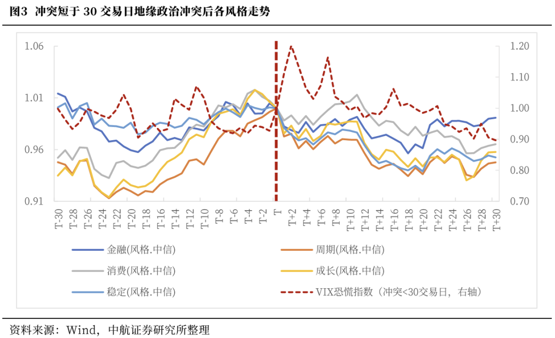 持续较短的地缘政治冲突,即冲突短于30交易日。冲突开始前VIX指数反应不明显,冲突开始后VIX指数快速提高,显示市场情绪迅速恶化。万得全A也因此由避险情绪主导快速下跌,冲突起始日T至最低点T 4平均下跌3.07%。但伴随VIX恐慌指数回落,A股反弹,最低点至反弹最高点T 12平均上涨1.73%。