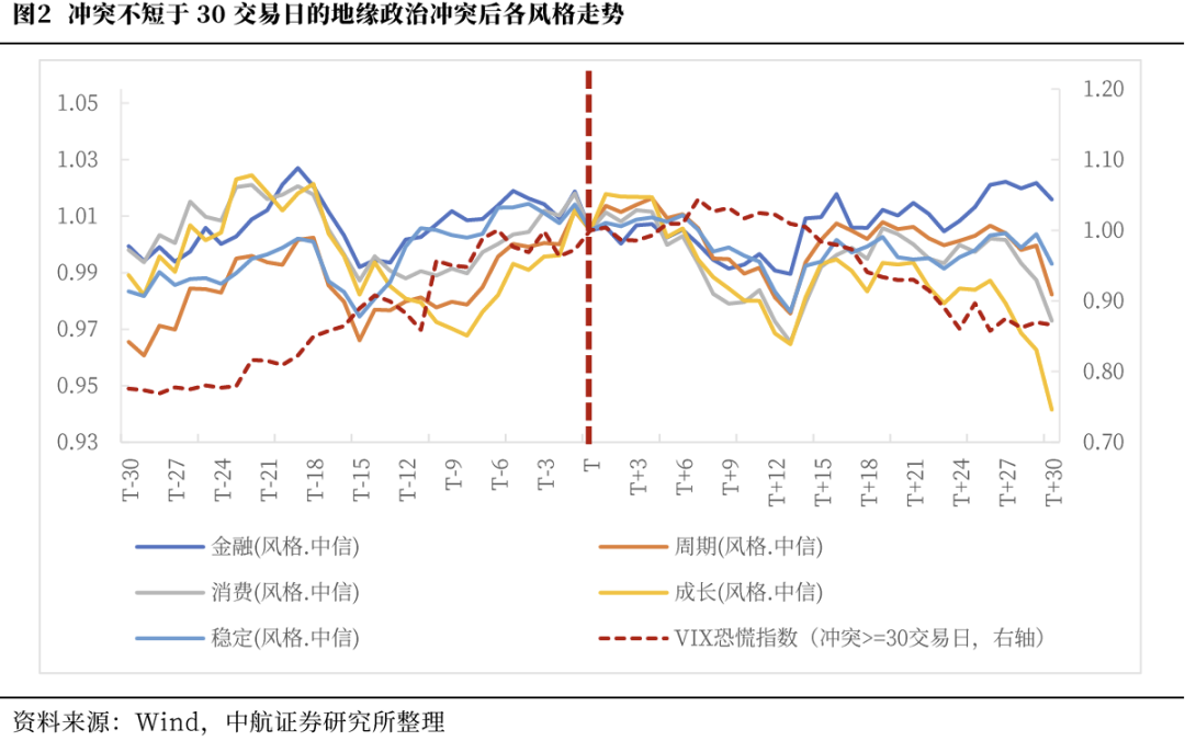 持续较长的地缘政治冲突中,受到避险情绪冲击,中信五风格在T至T 13日区间普跌,其中金融风格相对抗跌,成长、消费跌幅更多。T 13个交易日后市场情绪恢复,市场风险各风格全面反弹约3个交易日,然后转为平稳。至大盘反弹的高点T 19后,各风格分化,金融风格震荡上涨,成长风格持续走弱。虽然都经历下跌反弹,经过30交易日的市场消化,金融风格补涨至超过起始水平,成长风格跌幅较大。