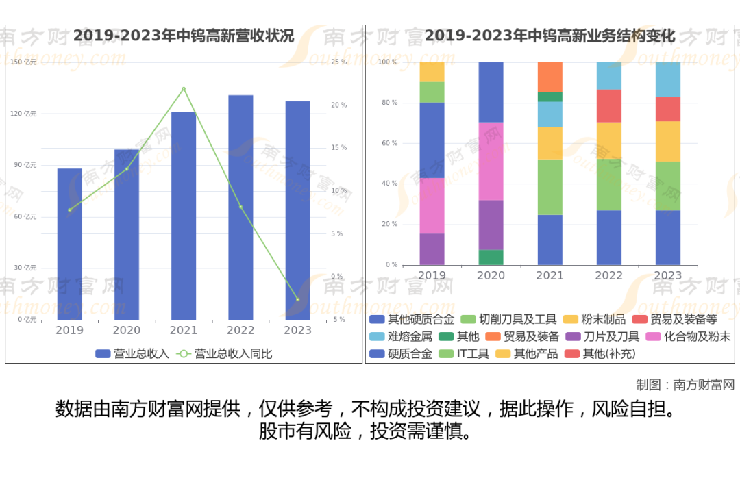 中钨高新于1996年12月5日在深圳证券交易所上市,公司主营业务为主要从事钨制硬质合金和钨、钼、钽、铌等有色金属及其深加工产品和装备的研制、开发、生产、销售及贸易业务。