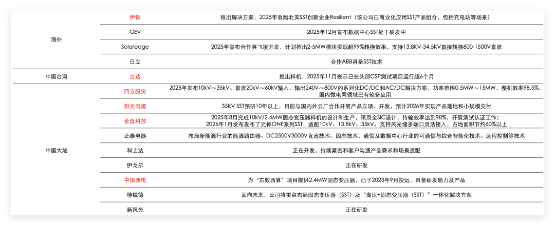 中国大陆厂商四方股份全球首台全碳化硅SST已在示范项目中应用,效率较传统变压器提升2%以上;新特电气与维谛合作开发高频变压器,应用于数据中心电源系统,体积较传统产品缩小50%;伊戈尔作为光伏和储能升压变出海龙头,在SST领域也有所布局。