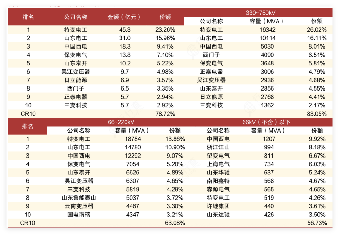 特变电工作为全球变压器龙头,覆盖全系列变压器产品;中国西电具有央企背景,其超高压和特高压技术领先,是国家重点工程的核心供应商;保变电气在特高压换流变、核电用变压器技术方面具有优势,是电网的核心供应商。