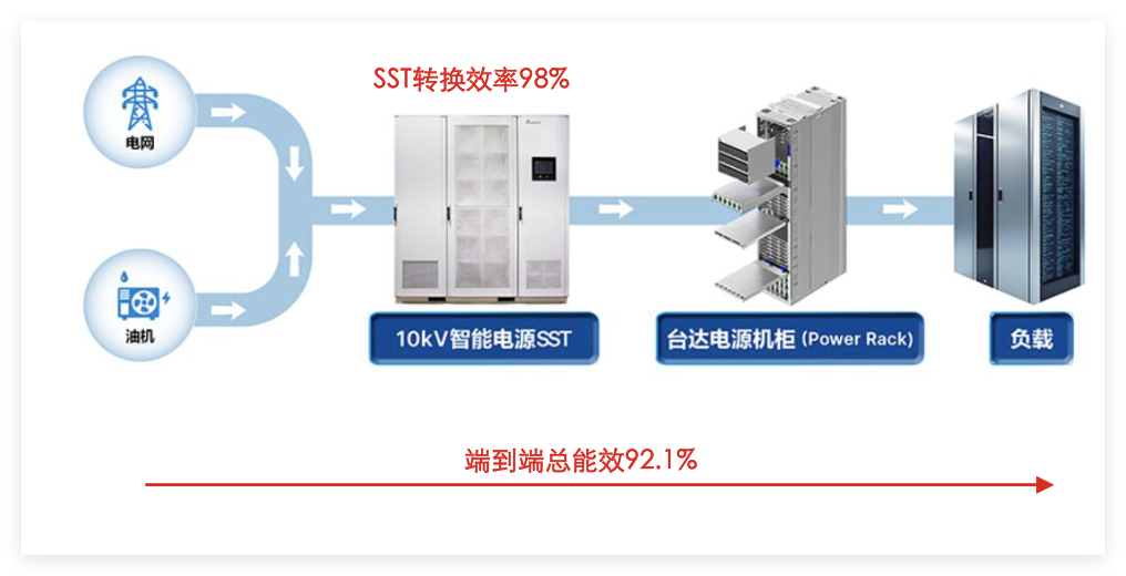 根据台达,传统供电 架构端到端总能效为89.1%,使用SST后端到端效率可提升至92.1%。