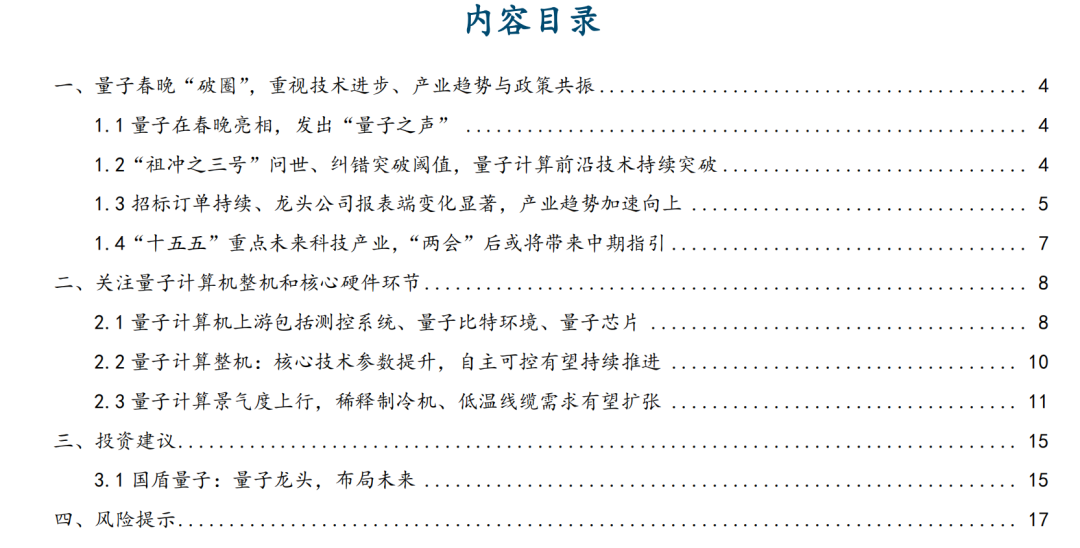 量子被纳入“十五五”规划,两会后中期指引更加清晰,超算中心、研究所、商业公司招标或将持续释放,产业规模有望快速扩张。核心公司订单、收入高增,印证板块景气度拐点,我们看好量子计算整机和稀释制冷机板块需求放量,建议重点关注量子计算整机和稀释制冷机环节。