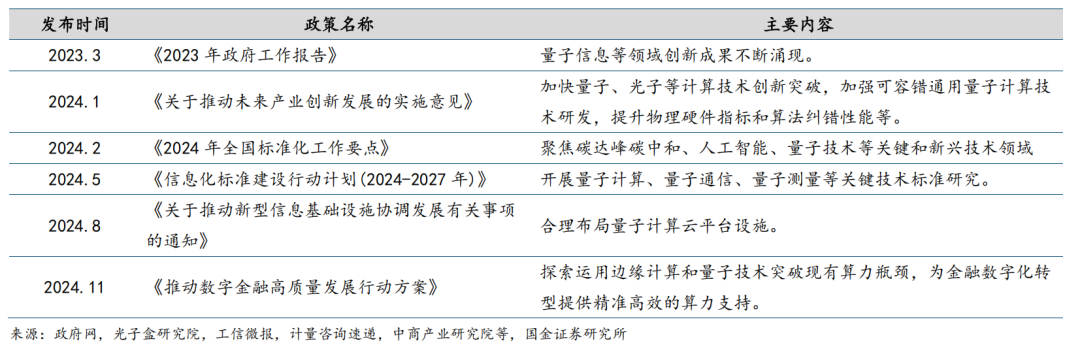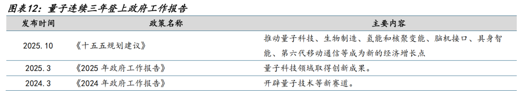 量子首登“十五五”规划。1)顶层持续强调量子科技:量子科技连续三年被写入政府工作报告,并首次写入“十五五”规划中,顶层政策持续重视量子技术;2)工信部等出台政策:24年工信部发布《关于推动未来产业创新发展的实施意见》等政策推动量子计算发展。两会任务之一是审查“十五五”规划纲要草案,按照惯例两会后纲要全文将会公布,有望为量子科技带来中期指引。