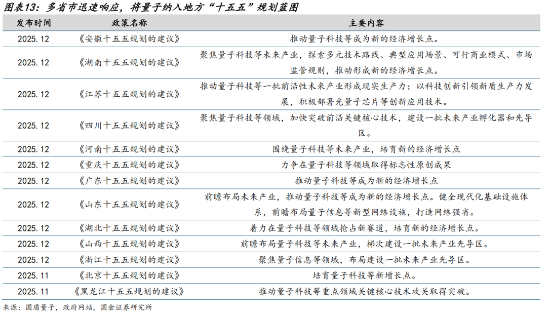 多地区跟进量子写入“十五五”,看好量子政策端助力产业发展。随着中共中央“十五五”规划建议明确“推动量子科技等未来产业成为新的经济增长点”,多省市迅速响应,将其纳入地方“十五五”规划蓝图,看好量子政策端助力产业发展。