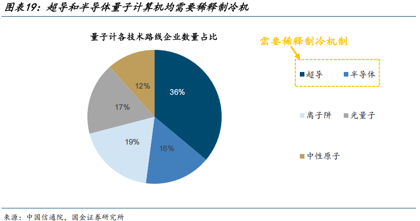 超导和半导体量子计算机需要稀释制冷机。从技术路线角度来看,全球超导、半导体、离子阱、光量子、中性原子企业数量占比分别为36%、16%、19%、17%、12%,其中需要稀释制冷机提供超低温环境的技术路线为超导和半导体路线,企业数量占比达52%。