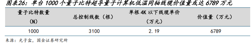 根据光子盒统计的市场情况,预计4K以下同轴电缆每根价格为2.19万元,基于此价格计算,一台1000个量子比特的超导量子计算机低温同轴线缆(4K以下)的价值量达6789万元。