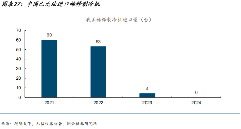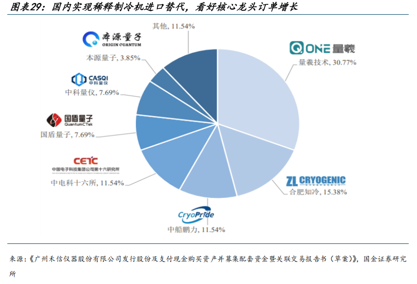 国内稀释制冷机基本实现进口替代,看好国产龙头厂商受益行业扩张。根据《广州禾信仪器股份有限公司发行股份及支付现金购买资产并募集配套资金暨关联交易报告书(草案)》,稀释制冷机已实现国产替代,量羲技术为国内龙头,2024年国内市占率达30.77%,领先第二合肥知冷份额15%以上,看好国产龙头厂商受益行业扩张。