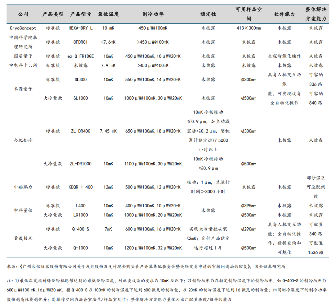 国产设备核心参数部分对标全球龙头。从全球看,量子计算稀释制冷机的主要供应商有Bluefors(芬兰)、Oxford Instruments(英国)、CryoConcept(法国)等,其中Bluefors占据了全球70%市场份额。国内主要供应商包括量羲技术、合肥知冷、中电科16所,在最低制冷温度对标海外龙头,制冷功率、稳定性、整体解决方案能力国内厂商逐渐逼近全球龙头Bluefors。