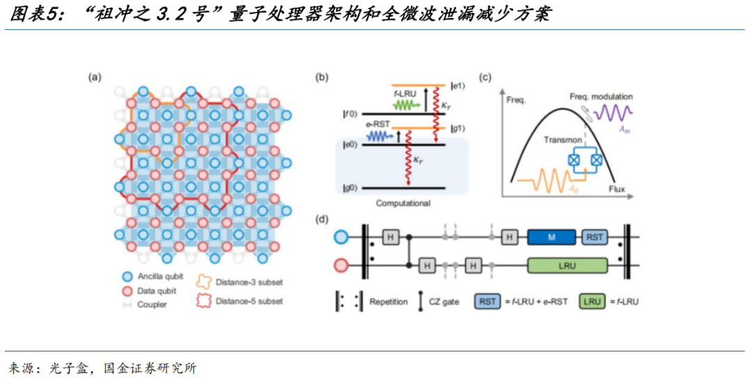 “祖冲之3.2号”对比谷歌:1)同:均实现了低于纠错阈值的量子纠错,原理上随着物理比特数目(即码距)的增加,逻辑比特的错误率能够不断降低。2)异:谷歌采用直流脉冲量子态泄漏抑制方法,要求谐振腔频率必须低于量子比特频率、所需的低频控制线布线复杂,硬件开销巨大;中科大团队采用全微波泄漏抑制架构,相较于谷歌的方案而言,无任何额外空间或时间开销,实现零冗余设计。